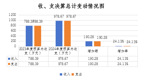 2024年度收、支總計(jì)均為978.67萬元。與2023年度相比,2024年度預(yù)算收入978.67萬元,比上年預(yù)算收入788.39萬元增加190.28萬元,增加24.13%,收入增加的主要原因是:財(cái)政追加“巴適購”電商平臺(tái)建設(shè)補(bǔ)助、革命老區(qū)重點(diǎn)城市對(duì)口合作(金華-巴中)等企業(yè)發(fā)展資金項(xiàng)目;增人增資及社會(huì)保障繳費(fèi)預(yù)算收入總數(shù)增加等。