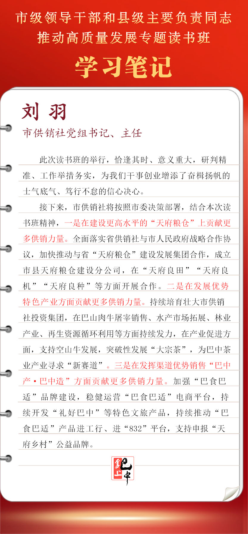 接下來,市供銷社將按照市委決策部署,結(jié)合本次讀書班精神,全面落實(shí)省供銷社與市人民政府戰(zhàn)略合作協(xié)議,加快推動與省“天府糧倉”建設(shè)發(fā)展集團(tuán)合作,成立市縣天府糧倉建設(shè)分公司,在“天府良田”“天府良機(jī)”“天府良種”等方面開展合作。持續(xù)培育壯大市供銷社投資集團(tuán),在巴山肉牛屠宰銷售、水產(chǎn)市場拓展、林業(yè)產(chǎn)業(yè)、再生資源循環(huán)利用等方面持續(xù)發(fā)力,在產(chǎn)業(yè)促進(jìn)方面,支持空山牛發(fā)展,突破性發(fā)展“大宗茶”,為巴中茶業(yè)產(chǎn)業(yè)尋求“新賽道”。加強(qiáng)“巴食巴適”品牌建設(shè),穩(wěn)健運(yùn)營“巴食巴適”電商平臺,持續(xù)開發(fā)“禮好巴中”等特色文旅產(chǎn)品,持續(xù)推動“巴食巴適”產(chǎn)品進(jìn)工行、進(jìn)“832”平臺,支持申報“天府鄉(xiāng)村”公益品牌。